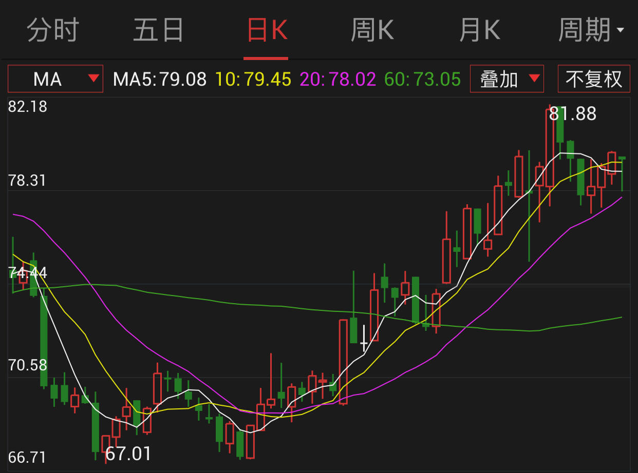 那什么叫复权呢?我们知道一般为了呈现股票在一段时间内的波动情况,都会用如下图所示的 K 线图去衡量股价的走势。