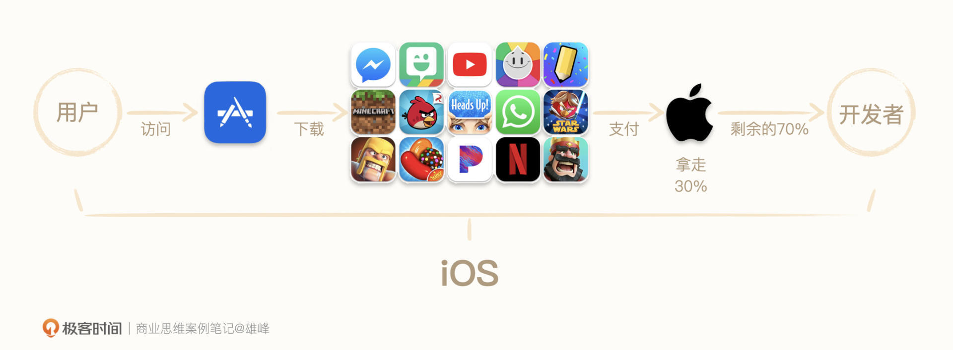 由于苹果在最开始手机售卖的时候,就构建起来了闭环的生态体系(iOS系统+App Store生态+Apple Pay),用户想在iPhone安装任何一个应用或者游戏,都必须得通过App Store,这就导致它可以要求用户在应用或者游戏内的所有付费行为,包括会员付费、版权购买、游戏充值、文章打赏等,都收走全额的30%。