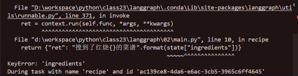 一共有两处改动。第一,State 我不直接用 dict 类型了,而是写一个 State 类,里面存放两个变量,一个是每一步都需要的 ingredients 变量,也就是“羊排”。另一个修改则是每一步的返回值 ret,由于需要存多个 ret,因此需要把它定义成列表。