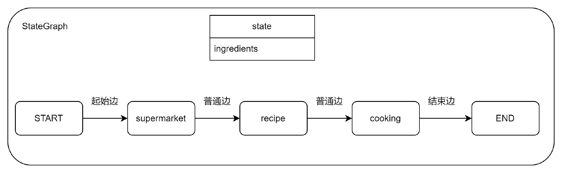 而在 supermarket 方法中就用到了 state,使用 state[“ingredients”] 获取了食材参数的值,也就是羊排。节点方法的输出也有要求,必须是 dict ,因此第 4 行用了字典方式输出。
