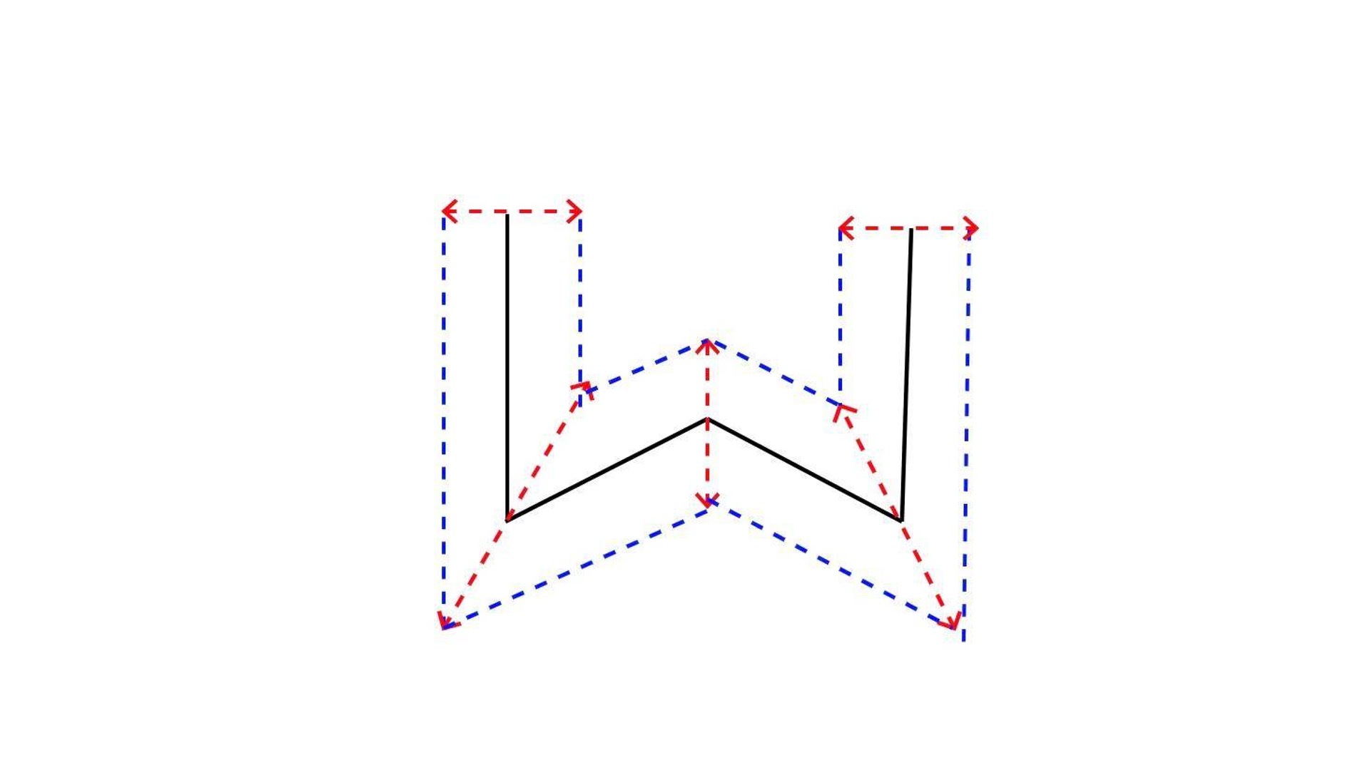 如上图所示,黑色折线是原始的1个像素宽度的折线,蓝色虚线组成的是我们最终要生成的带宽度曲线,红色虚线是顶点移动的方向。因为折线两个端点的挤压只和一条线段的方向有关,而转角处顶点的挤压和相邻两条线段的方向都有关,所以顶点移动的方向,我们要分两种情况讨论。