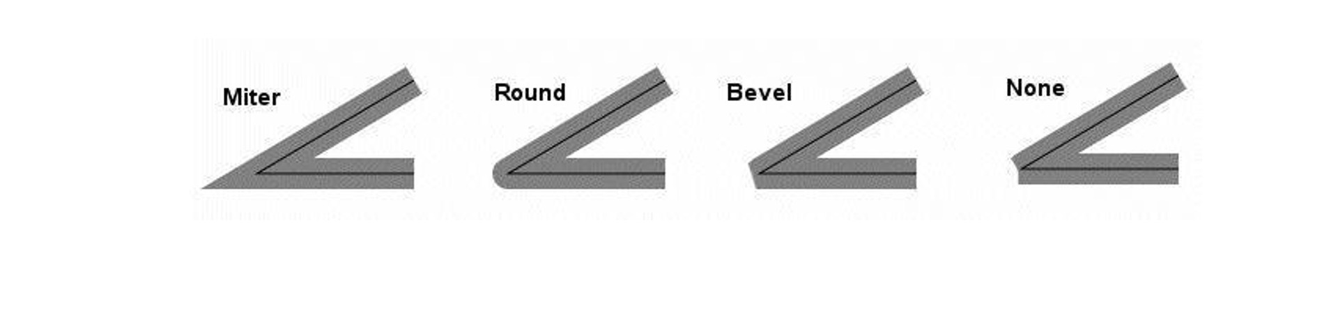 比如说,你可以看我给出的这张图,上面就显示了四种不同的lineJoin。其中,miter是尖角,round是圆角,bevel是斜角,none是不添加lineJoin。很好理解,我就不多说了