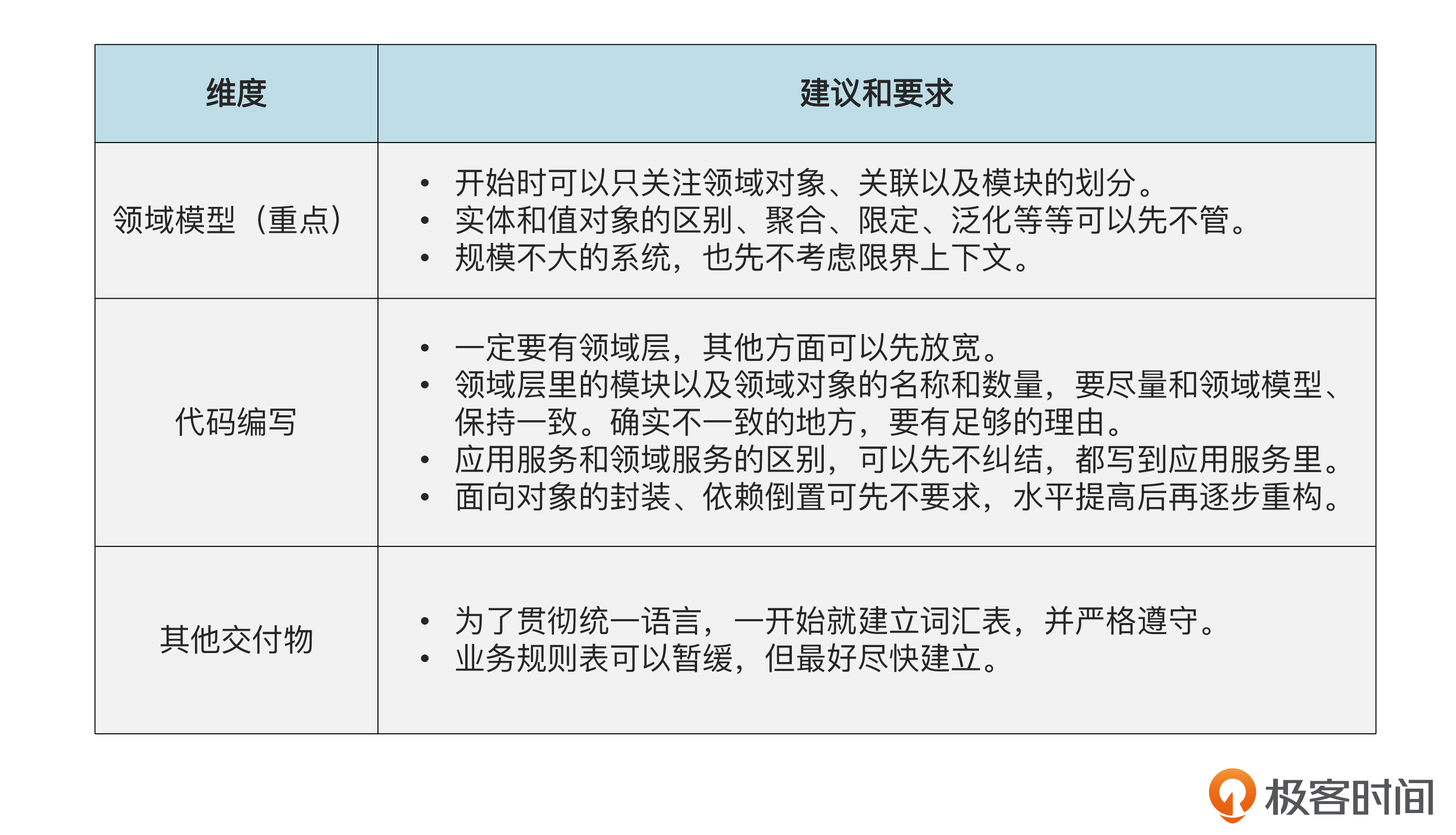 所以,建议的做法是,首先选择系统中一个相对独立的小模块,然后按照前面的 4 步,尽快落地到代码并上线,建立最小闭环。通过这个过程,初步掌握 DDD落地技能并取得实际效果。同时,这么做也能培养人才,积累经验,建立必要的开发流程。完成之后,再选择下一个切片,逐步扩大范围,并深化 DDD 的技能。