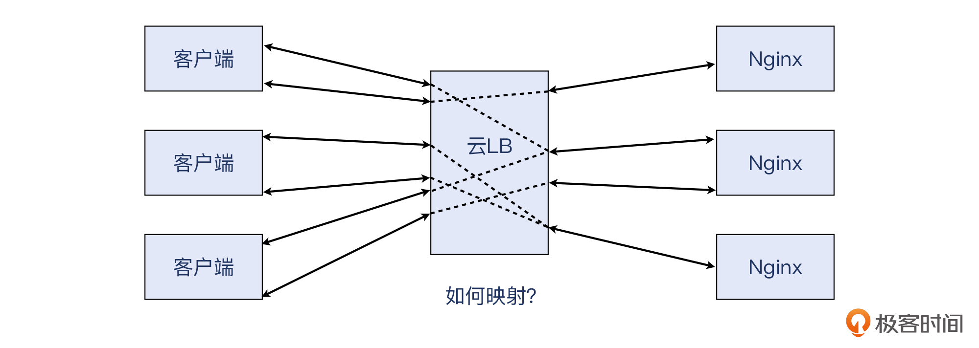 这也是一个不小的挑战。这个问题的抽象描述,就是:如何在一个 m:n 的场景里,找到确定的 1:1 关系。下图中,我用虚线表示了这种映射关系的未知性。