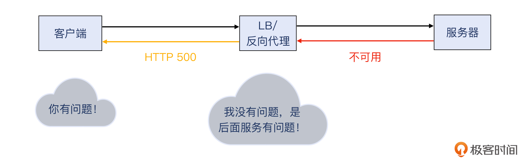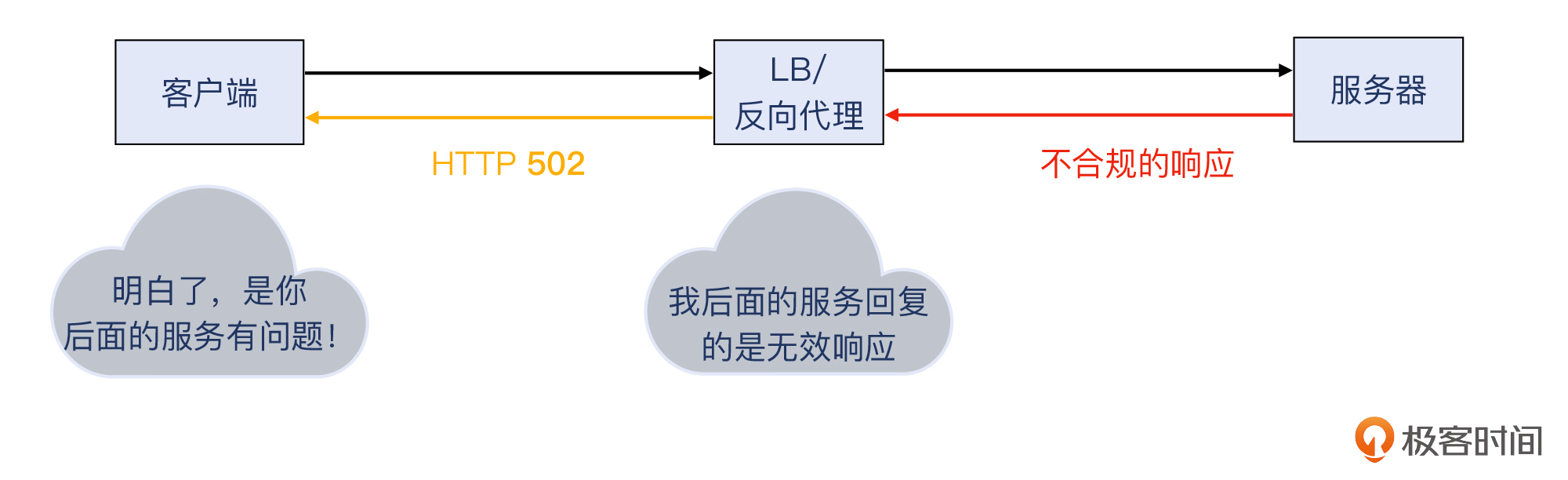 好,我们继续502/503/504的话题。因为反向代理 / LB是位于客户和服务之间的,如果服务坏了,而反向代理 / LB本身没坏,那么该给客户回复哪个返回码呢?500吗?可是服务端故障,但我反向代理 / LB自己可没故障啊。