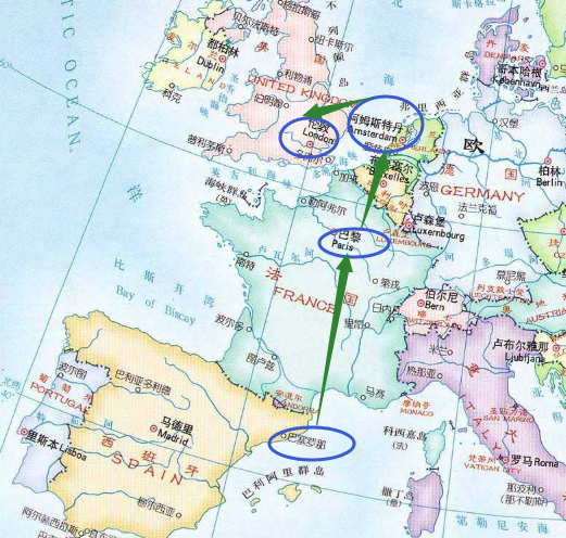 他们最近推出了一个旅游产品,可以让用户自主选择在欧洲旅行的多个城市之间,以自定义的顺序展开旅行。比如,你可以选择从西班牙的巴塞罗那启程,然后来到法国巴黎,随后踏上风车王国荷兰的领土,最后把日不落帝国的伦敦作为最后一站来结束旅行。以上旅程是由4个国家(城市)组成的: