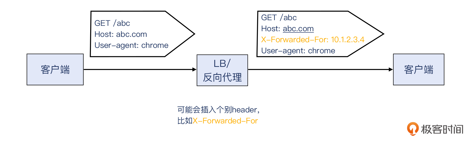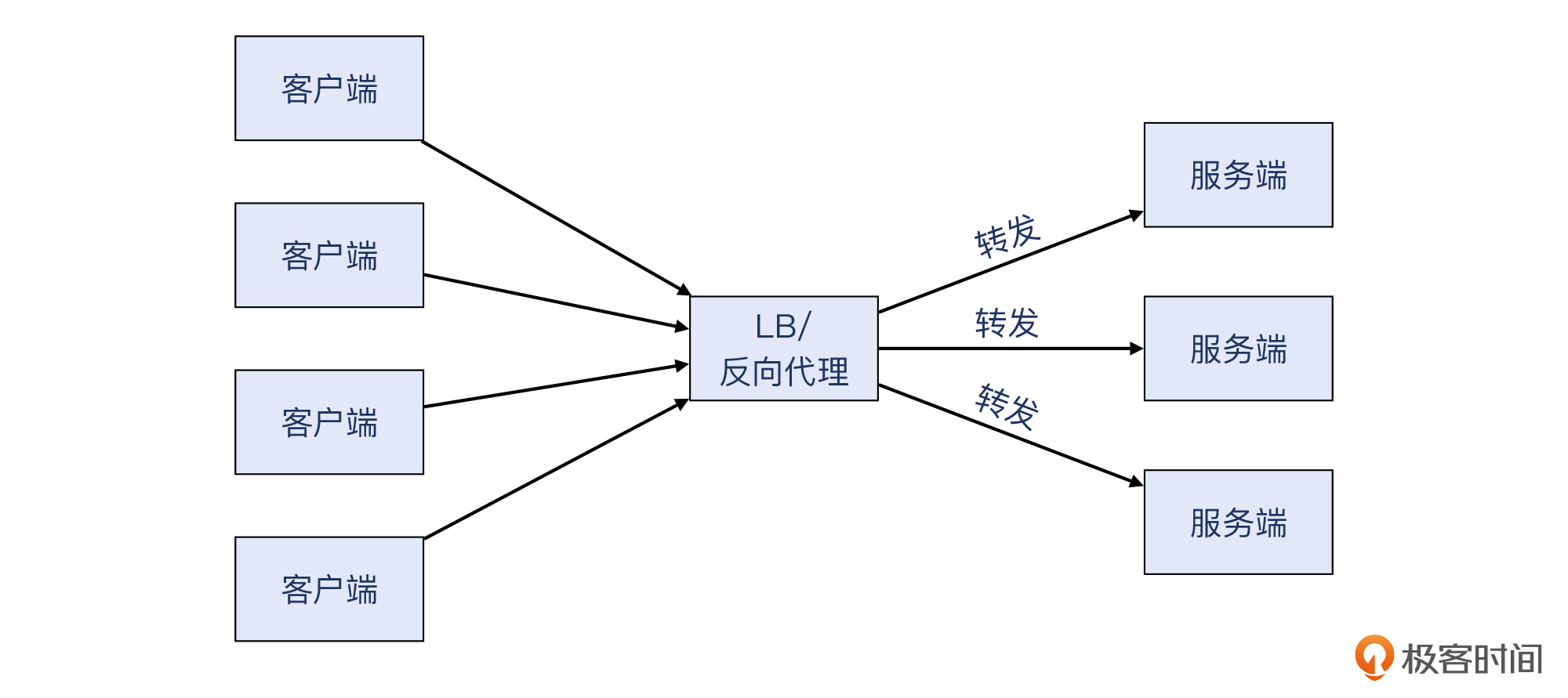 你可能也看出来了,502/503/504这几个返回码,都是给 反向代理 / LB 用的。反向代理 / LB位于客户和服务之间,起到了转发、分流、处理的作用。这里我稍微再给你展开一下这几类功能。