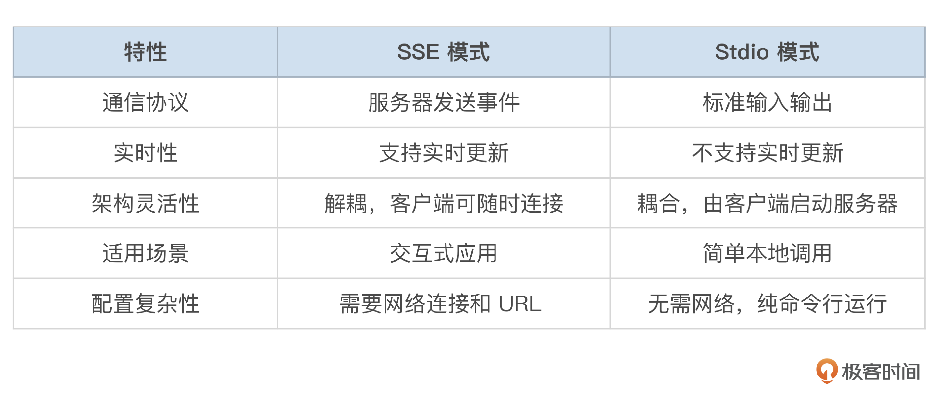 今天我们学习了 MCP Client 与 Server 之间的两种通讯方法,并使用代码实操的方式,体验了这两种方法的效果。这节课的代码已经放到了我的 GitHub 上。接下来我们通过一张表格,对这两种方式进行对比和总结。
