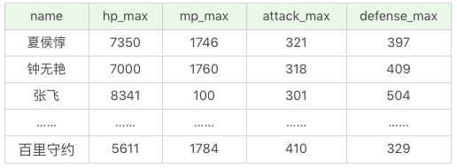 我创建了一个王者荣耀英雄数据表,这张表里一共有69个英雄,23个属性值(不包括英雄名name)。SQL文件见Github地址。