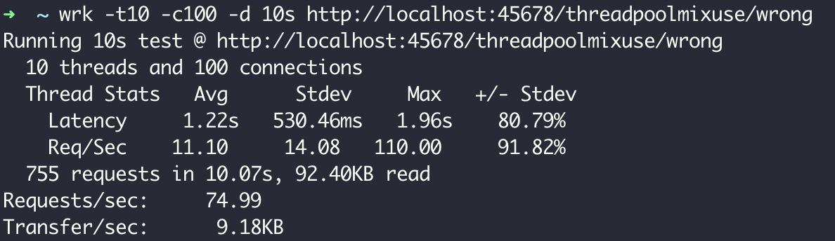 我们使用wrk工具对这个接口进行一个简单的压测,可以看到TPS为75,性能的确非常差。
