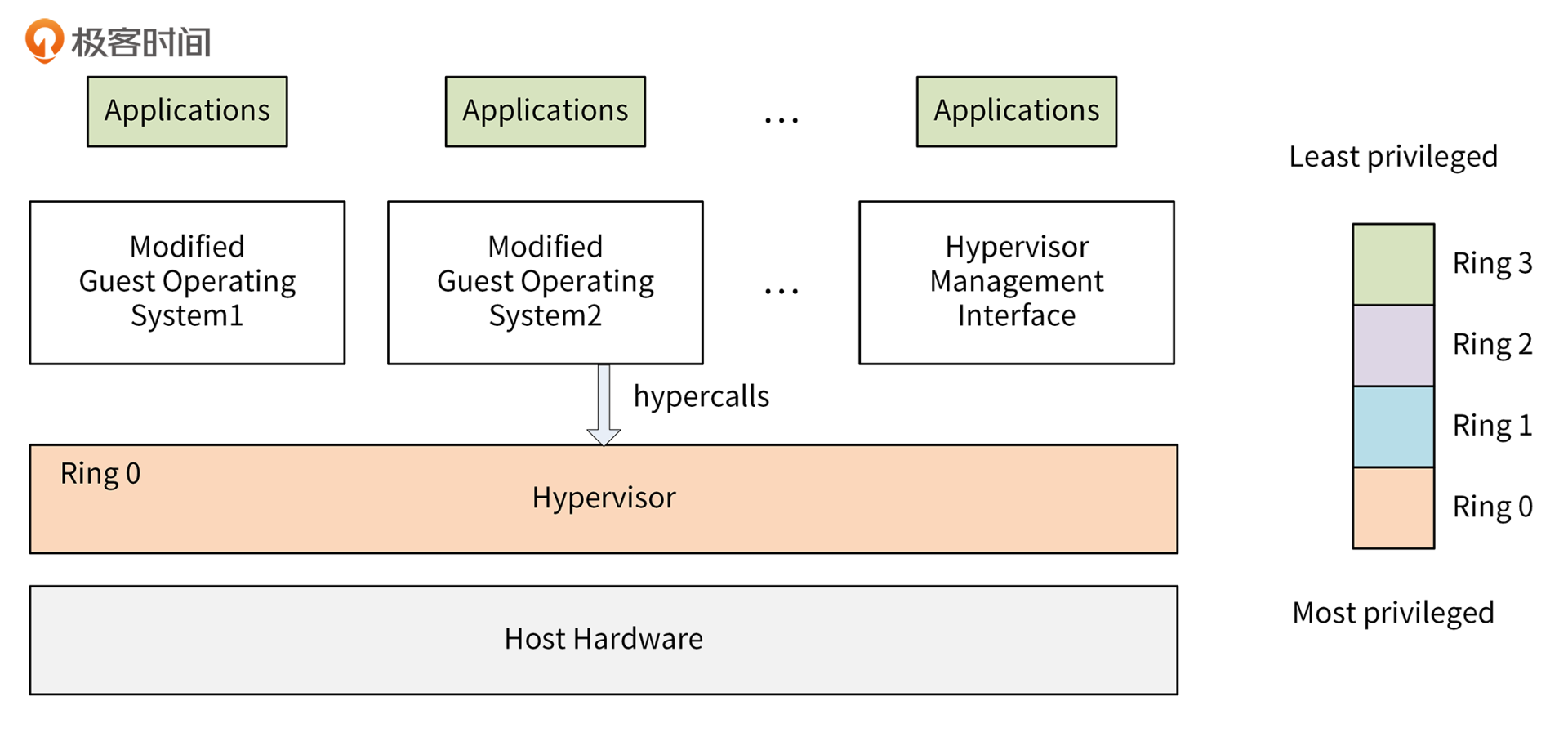 Para-virtualization的大概原理是这样的:Hypervisor运行在Ring 0中,修改客户机操作系统内核,将其中的敏感指令换成hypercall。hypercall是一个可以直接跟VMM通信的函数,这样就绕过了虚拟化的漏洞(相当于所有敏感指令都被VMM捕获了),同时不存在模拟和翻译的过程,所以性能是最高的。这个过程如下图所示: