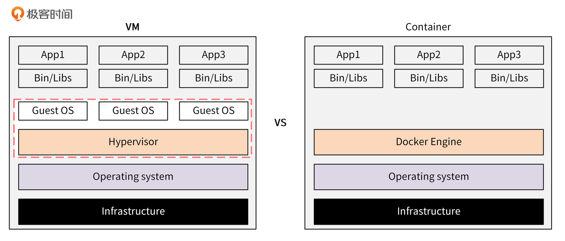 我这里拿Docker和虚拟机来做个对比,让你感受下Docker的强大。二者的架构对比如下图所示:
