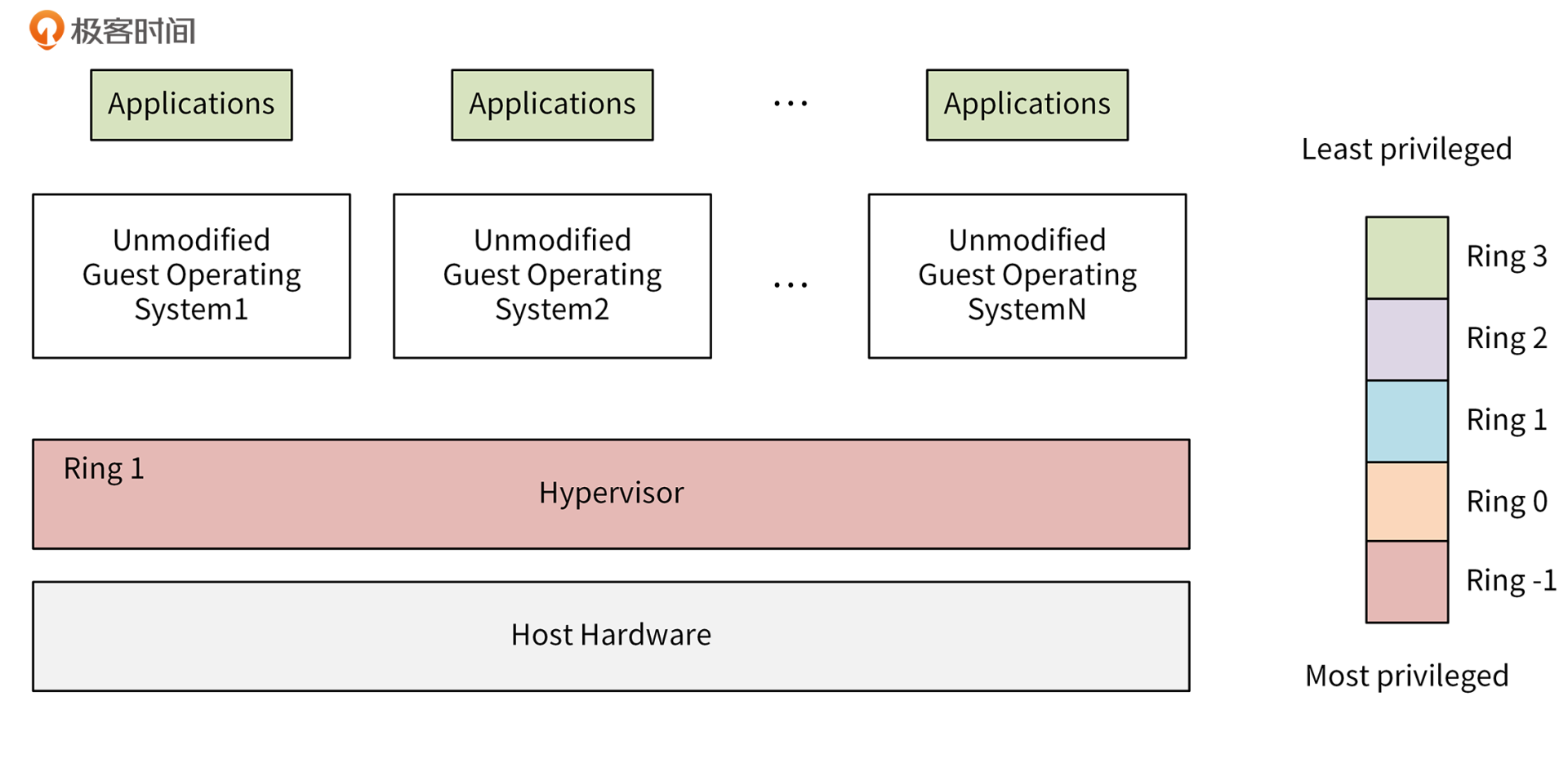 在2006年,Intel和AMD分别在硬件层面支持了虚拟化,比如Intel的VT-X技术和AMD的SVM。它们的核心思想都是引入新运行模式,可以理解为增加了一个新的CPU Ring -1,权限比Ring 0 还高,使VMM运行在Ring -1下,客户机内核运行在Ring 0下。