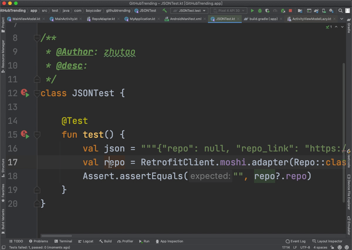 空安全 因为,我们还有一个问题没有解决:**如果服务端返回的JSON字段是null的话,我们的程序仍然会出错。**具体来说,我们可以用这个单元测试来模拟。