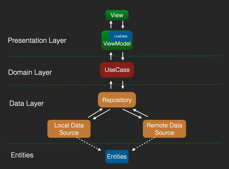 可以看到,上面这个架构,融入了MVVM与Clean两个架构的特点,让我们从下往上看: