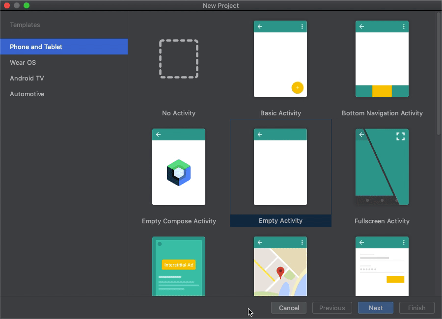 当配置好所有的环境以后,我们就可以像创建Kotlin工程一样,来创建一个新的Android工程了。