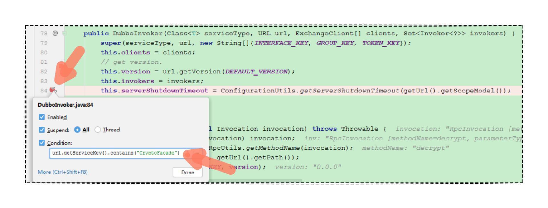 不过,可以发现 url 变量是从 DubboInvoker 的构造方法传入进来的,那我们继续在 DubboInvoker 的构造方法中打上条件断点,看看赋值 url 的源头到底是谁: