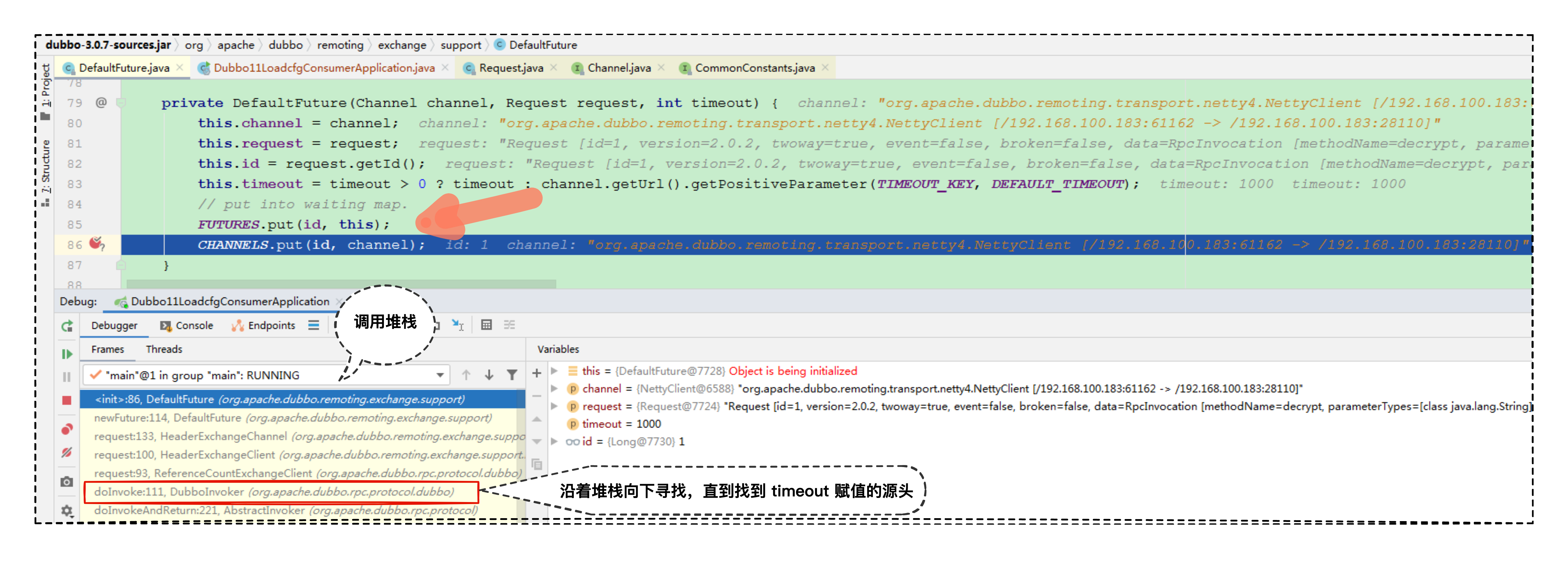 通过几次断点分析,我们从 DubboInvoker 中找到了两个引起 timeout 不能正确赋值的可疑点: