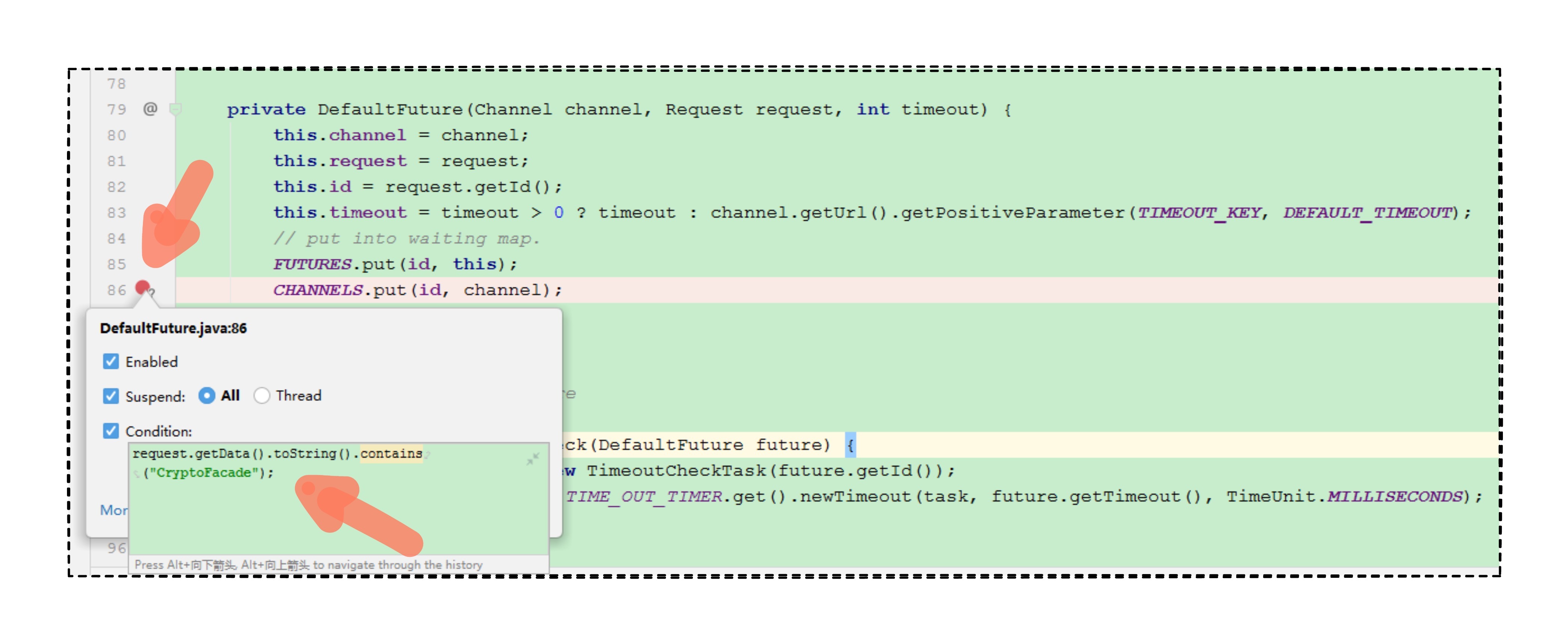 在刚刚找到的构造方法中,我们打上带条件的断点,来查看赋值 timeout 参数的源头在哪里: