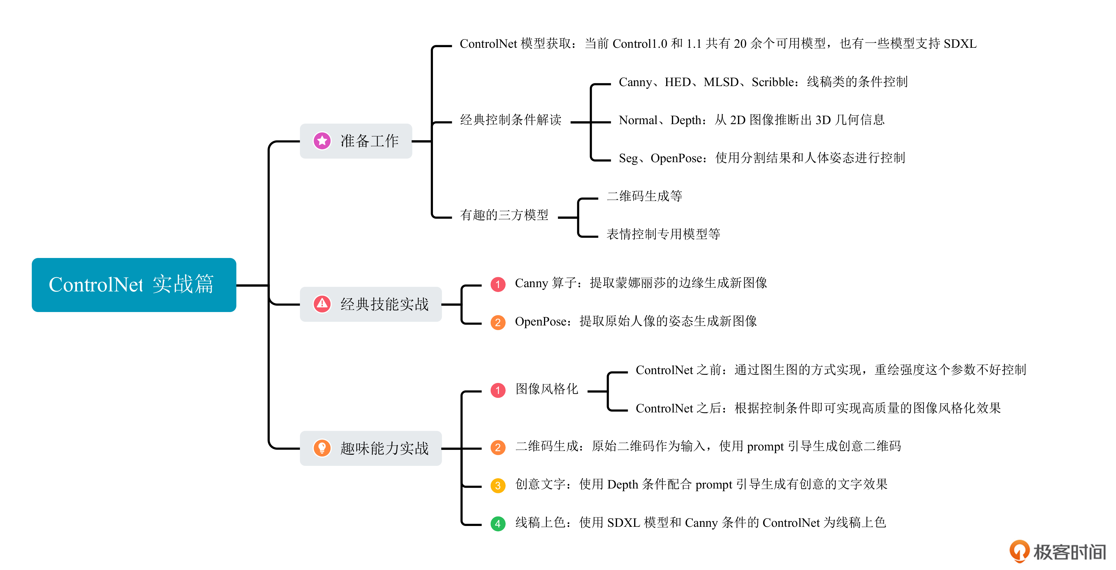 然后我们以实战的形式,体验了如何使用Canny和OpenPose作为控制条件实现AI绘画效果,并使用ControlNet完成了图像风格化、创意二维码生成、创意文字生成和线稿上色等趣味用法。