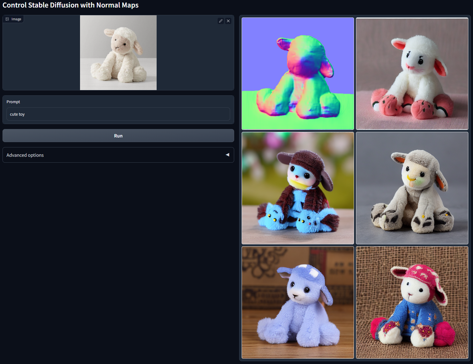 下一个是Normal条件,Normal代表图像的法线,也就是与图像中物体表面切平面垂直的向量,通常用红、绿、蓝三个通道来表示法线向量在X、Y和Z方向的分量。从后面这个例子可以看出,Normal条件能够帮我们从2D图像中推断出3D几何信息,用于ControlNet的图像生成任务上。