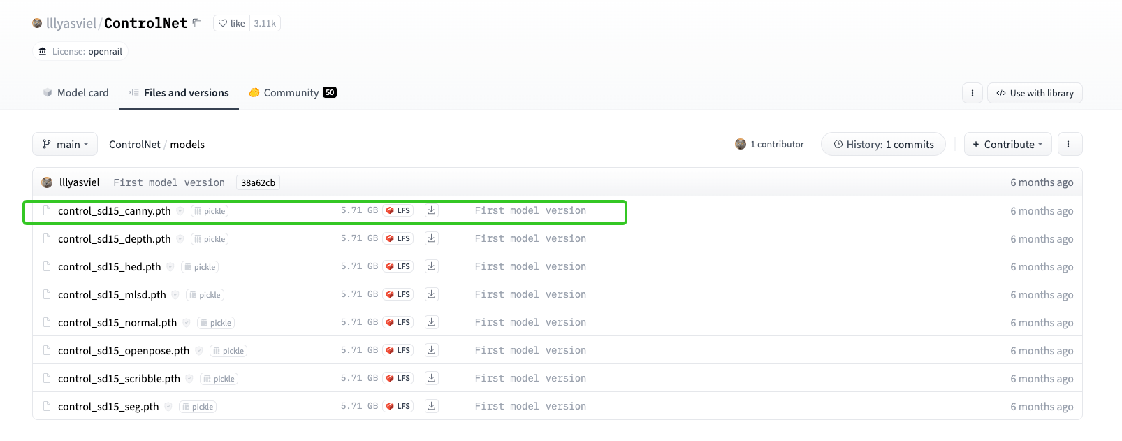 ControlNet1.0的8个模型可以通过后面这个 Hugging Face链接获取。我们可以看到ControlNet1.0各个模型的命名规则,以第一行的 “control_sd15_canny.pth” 为例,sd15表示用于训练这个ControlNet的基础模型是SD1.5,Canny便是ControlNet的控制条件是Canny算子,也就是提取原始图像的边缘。