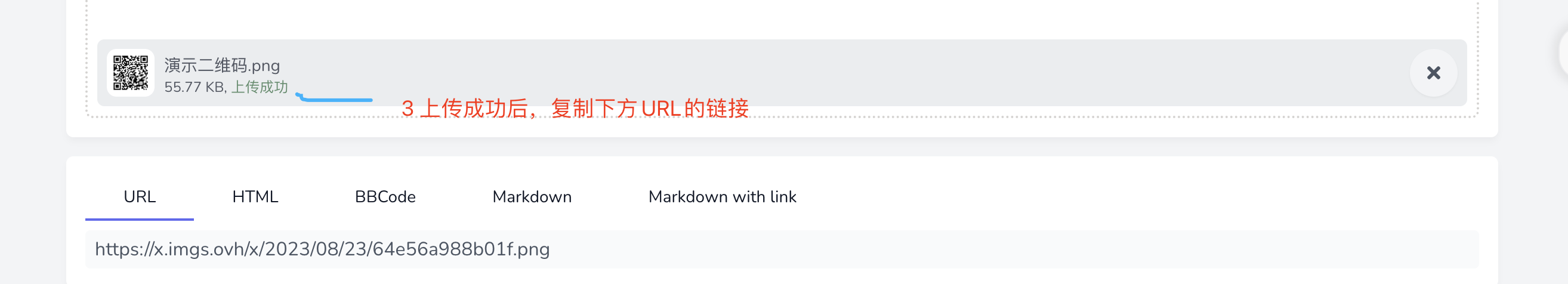 如果你想上传自己手里的原始二维码,可以进入这个链接,参考后面的示意图上传二维码图片,然后复制url链接,替换到后面截图位置的代码里。