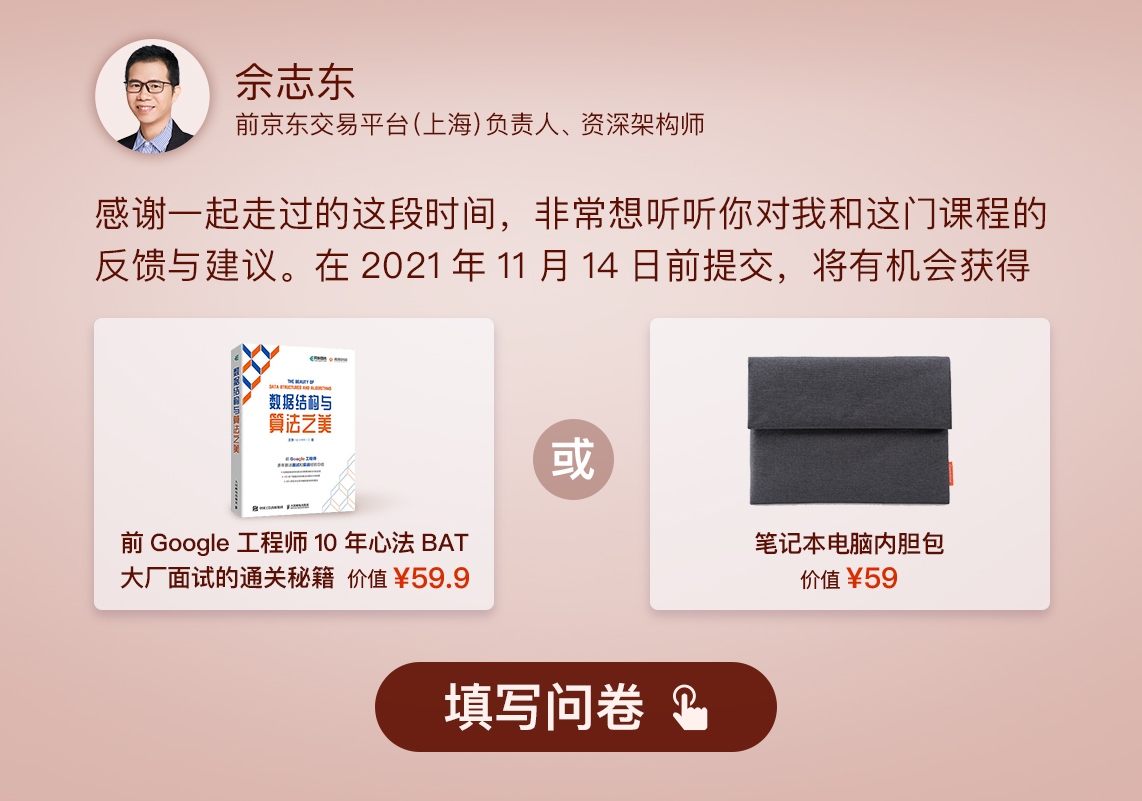 最后,文末有一份结课问卷,希望你可以花两分钟的时间填写一下。我会认真倾听你对这个专栏的意见或建议,期待你的反馈。
