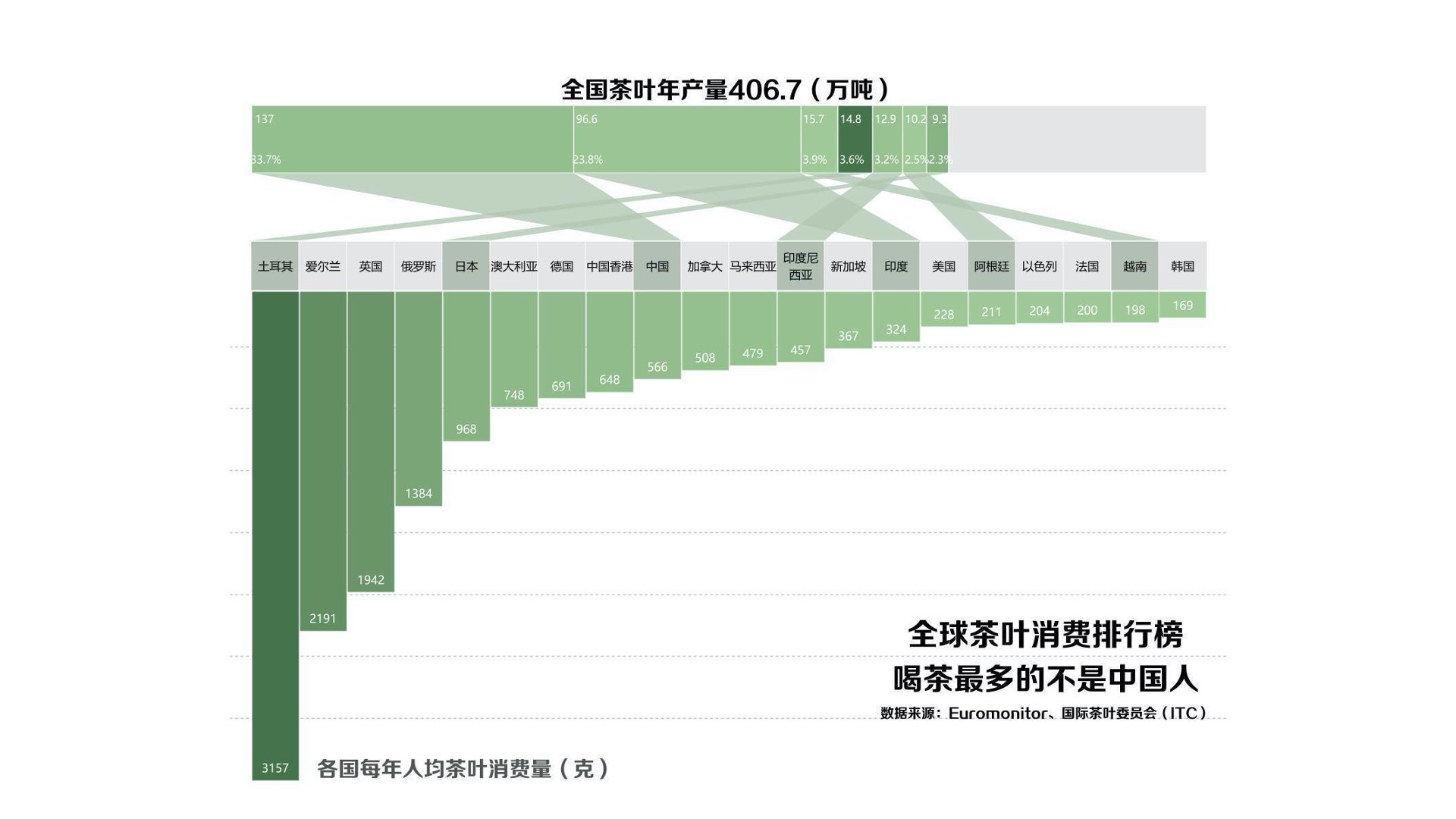 另外,这张图底部的直方图表示消费,上方的连线和最上面的横条表示什么,也不够清晰。如果我们仔细研究,还是可以看出,最上方的横条表示茶叶产量,其中33.7%供应国内,中国人均只消费了566克茶叶。由此,我们可以得出的结论是:中国是产茶大国,但茶叶消费数量不是最多的,茶叶更多会出口给印度、越南、土耳其和欧洲的一些国家。