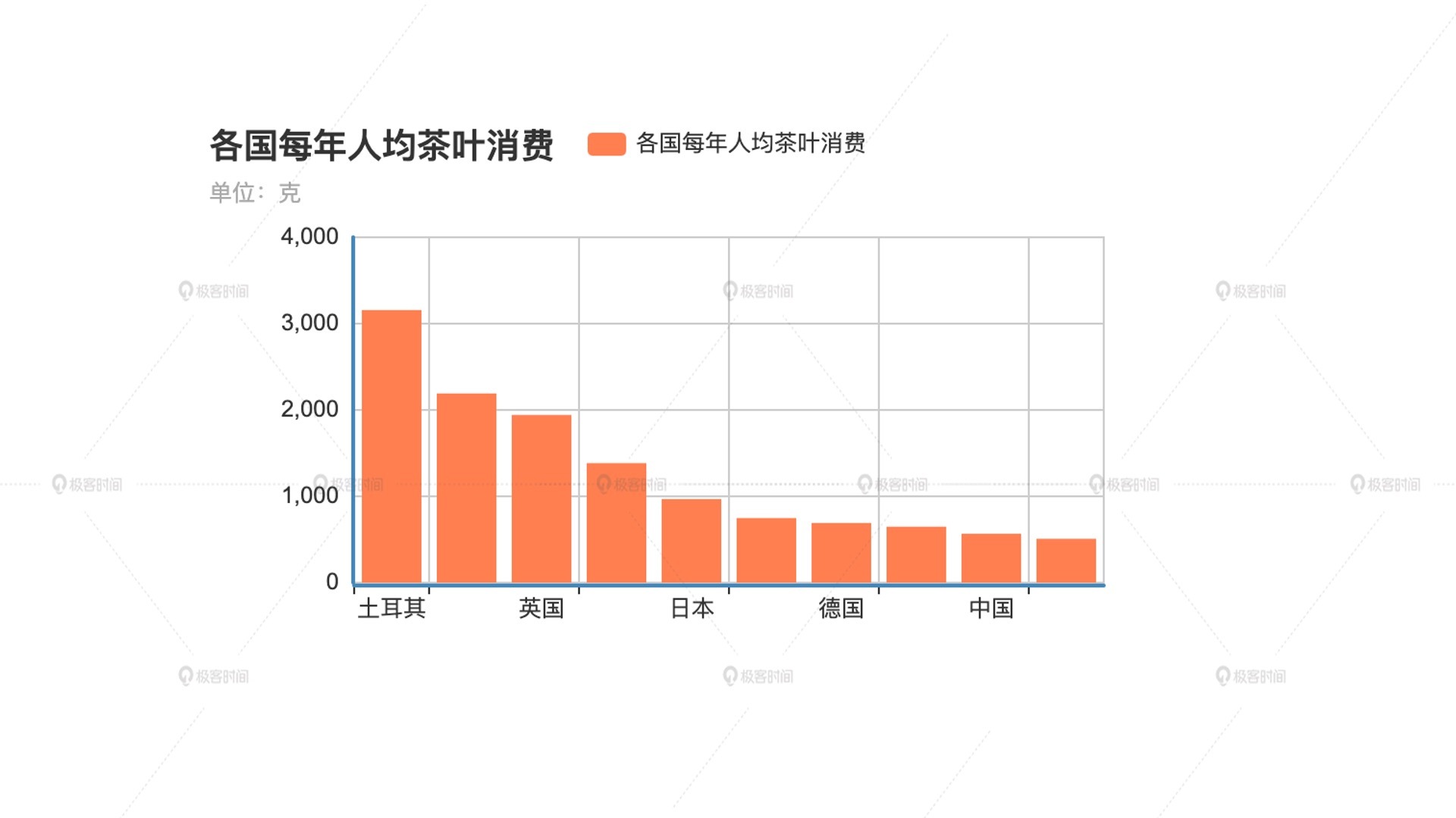 其次,我们完全不需要列出这么多的国家,列出更少的国家可以让用户更快地抓住重点。所以我们直接用下面的简单的直方图表达,就可以表示我们要表达的内容了。