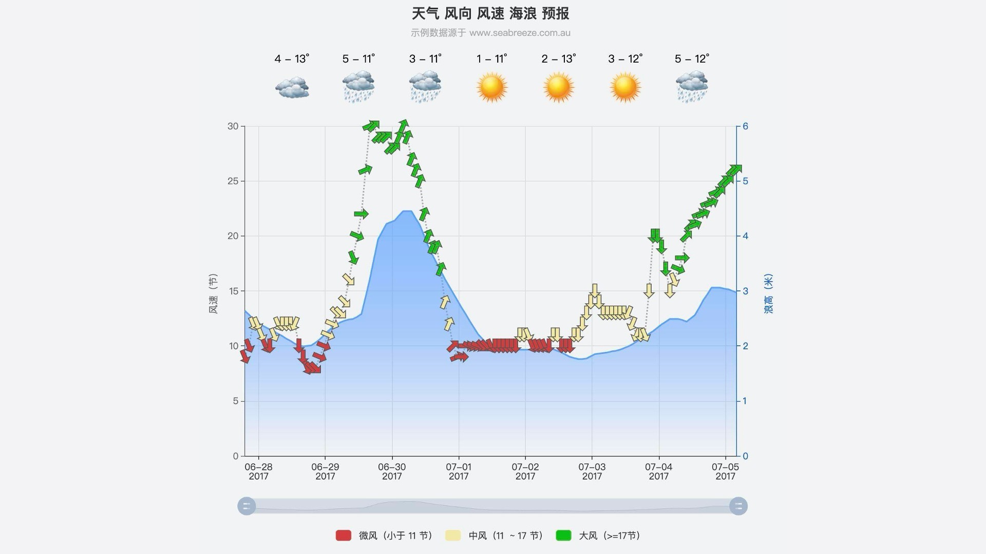 这是一张天级预报的图表,图表上同时显示了温度、天气、风向、风速、浪高这些变量,每个变量都采用了不同的形式来展示,区分度很好,内容非常清晰也很聚焦。另外,图表上的除了用不同的y轴高度来表示风速之外,还采用红色、黄色、绿色这三种颜色标记了不同的风速等级,这就是用两种方式表示同一个元素。