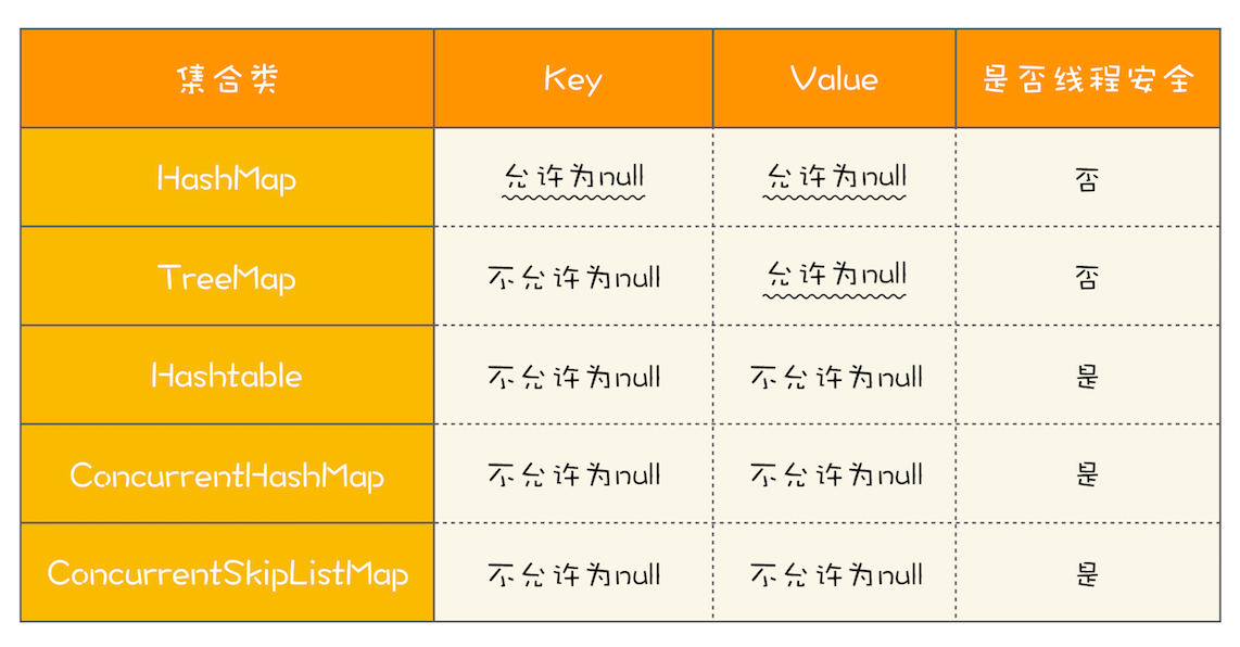使用ConcurrentHashMap和ConcurrentSkipListMap需要注意的地方是,它们的key和value都不能为空,否则会抛出NullPointerException这个运行时异常。下面这个表格总结了Map相关的实现类对于key和value的要求,你可以对比学习。