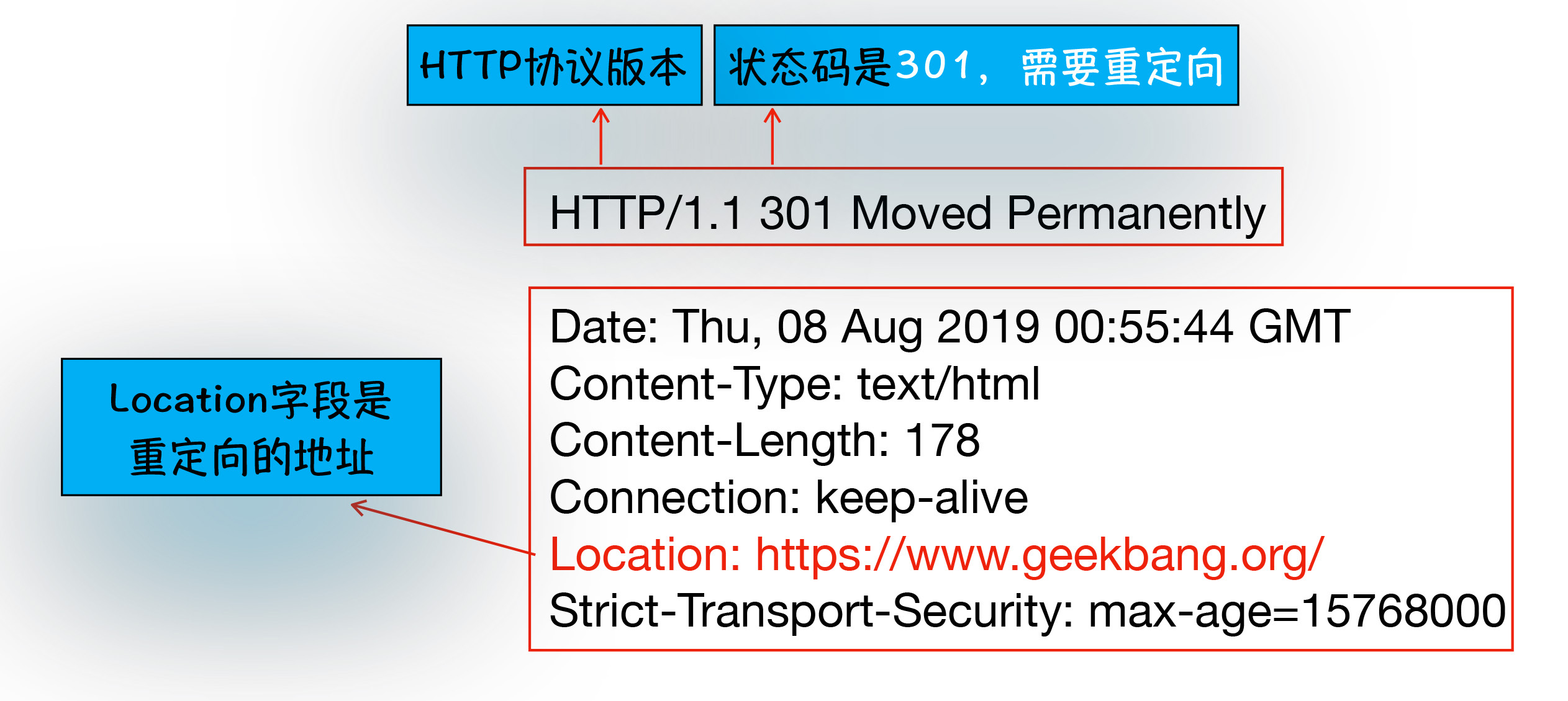 从图中你可以看到,响应行返回的状态码是301,状态301就是告诉浏览器,我需要重定向到另外一个网址,而需要重定向的网址正是包含在响应头的Location字段中,接下来,浏览器获取Location字段中的地址,并使用该地址重新导航,这就是一个完整重定向的执行流程。这也就解释了为什么输入的是 geekbang.org,最终打开的却是 https://www.geekbang.org 了。