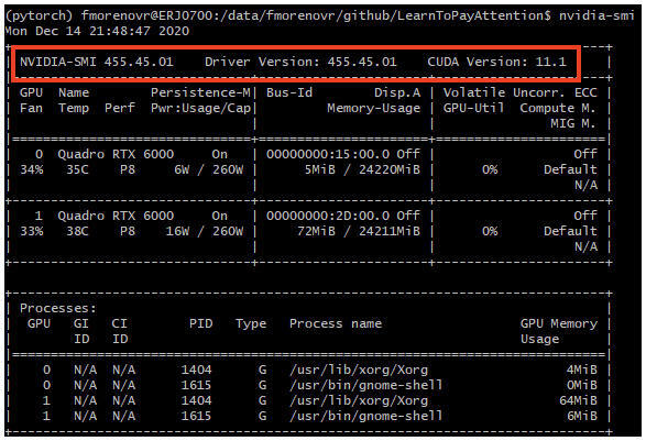 在终端中输入“nvidia-smi”命令,会显示出显卡驱动的版本和CUDA的版本,如下图所示。