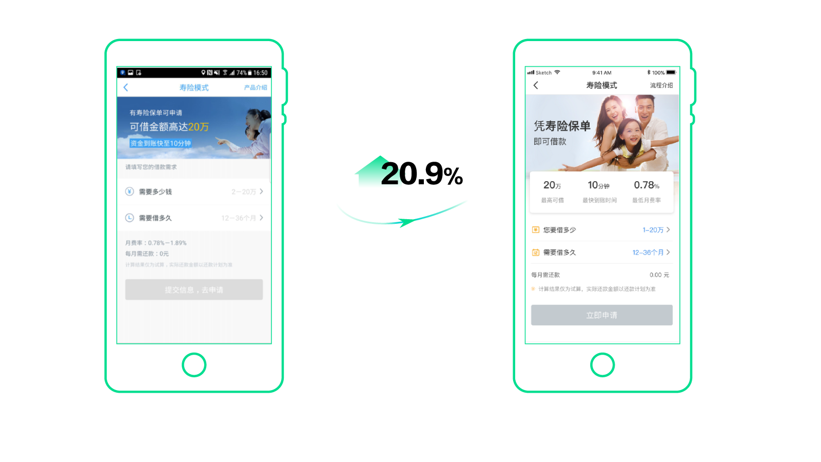比如,我们用同样的风格修改某条业务线的H5介绍页面,转化立刻提升了20%以上。之所以要先在App里的某个H5页面上尝试,是因为H5页面可以立刻看到效果,如果效果不佳也可以立刻替换回原先的版本,降低错误的风险。