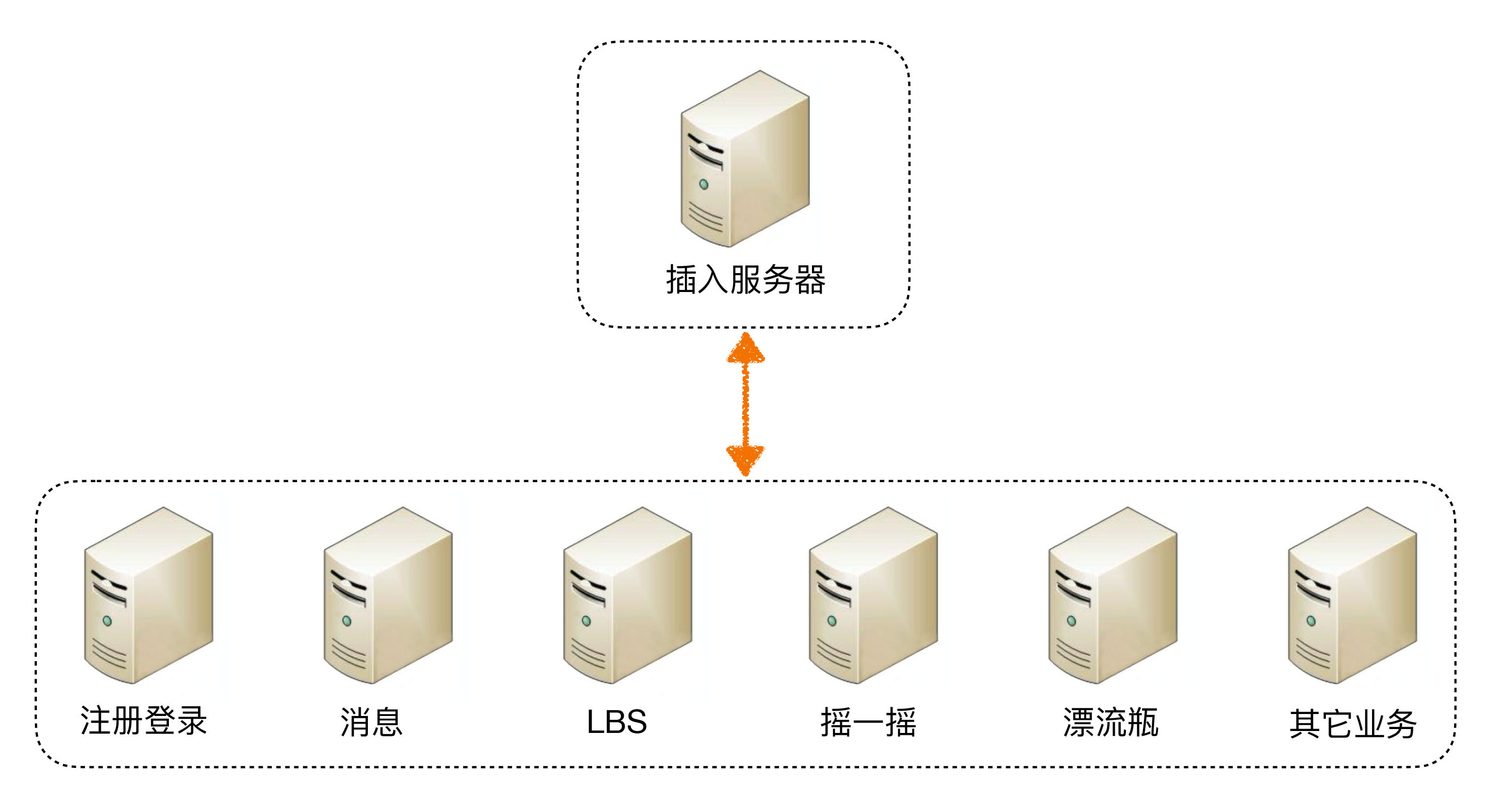 继续以上面“任务分配”中的架构为例,“业务服务器”如果越来越复杂,我们可以将其拆分为更多的组成部分,我以微信的后台架构为例。