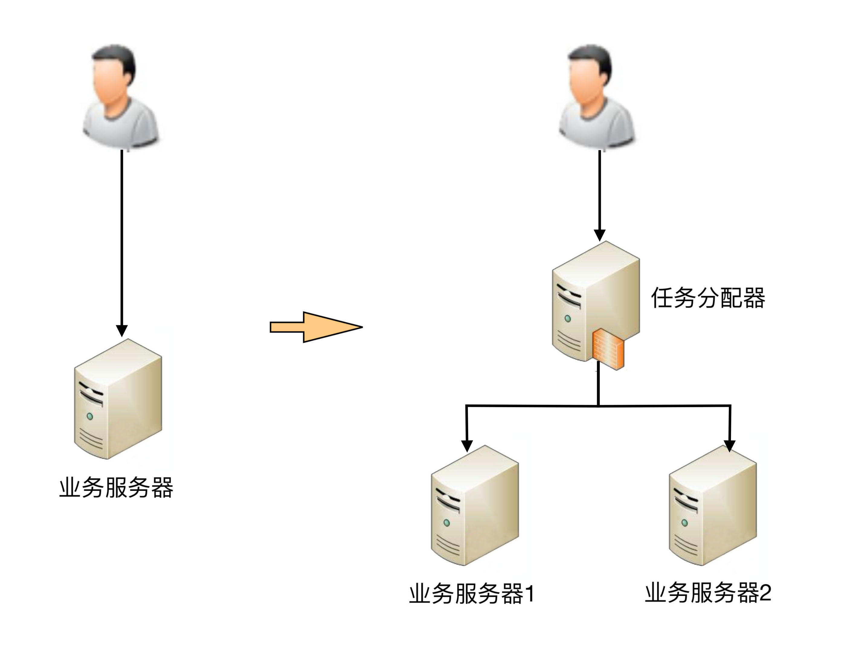 - 需要增加一个任务分配器,这个分配器可能是硬件网络设备(例如,F5、交换机等),可能是软件网络设备(例如,LVS),也可能是负载均衡软件(例如,Nginx、HAProxy),还可能是自己开发的系统。选择合适的任务分配器也是一件复杂的事情,需要综合考虑性能、成本、可维护性、可用性等各方面的因素。