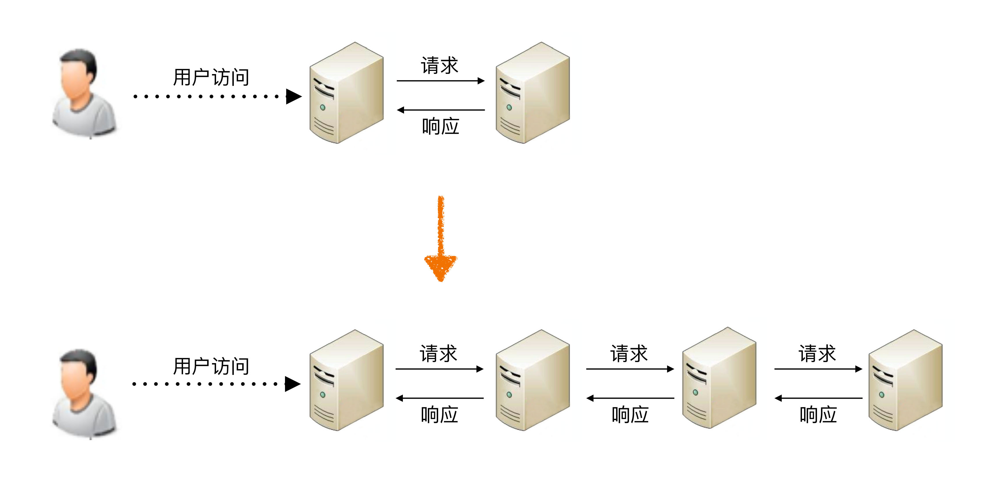 从图中可以看到,当系统拆分2个子系统的时候,用户访问需要1次系统间的请求和1次响应;当系统拆分为4个子系统的时候,系统间的请求次数从1次增长到3次;假如继续拆分下去为100个子系统,为了完成某次用户访问,系统间的请求次数变成了99次。