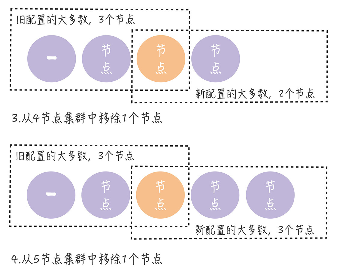 从上图中你可以看到,不管集群是偶数节点,还是奇数节点,不管是增加节点,还是移除节点,新旧配置的“大多数”都会存在重叠(图中的橙色节点)。