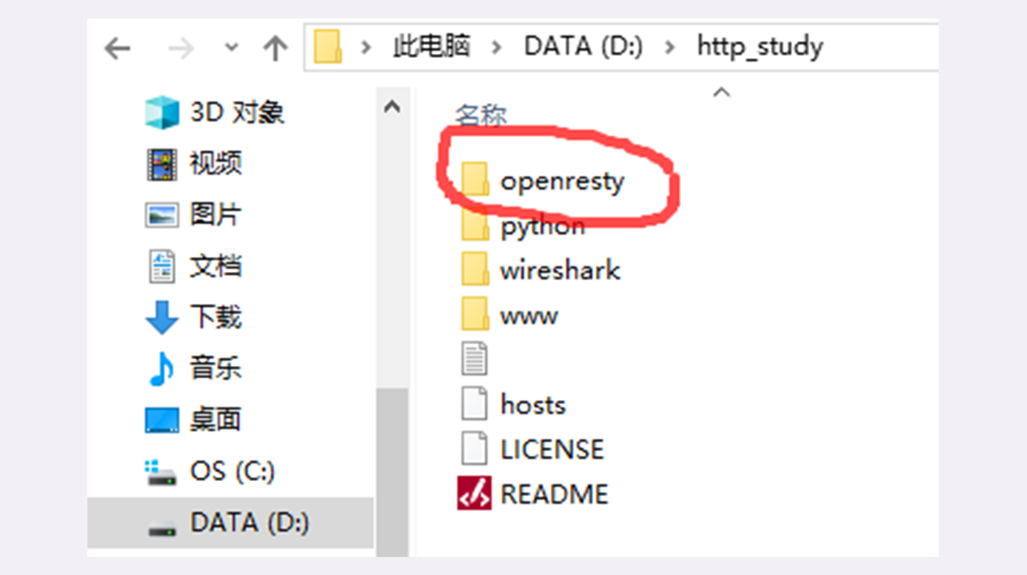 然后要注意,你必须把OpenResty的压缩包解压到刚才的“D:\http_study”目录里,并改名为“openresty”。