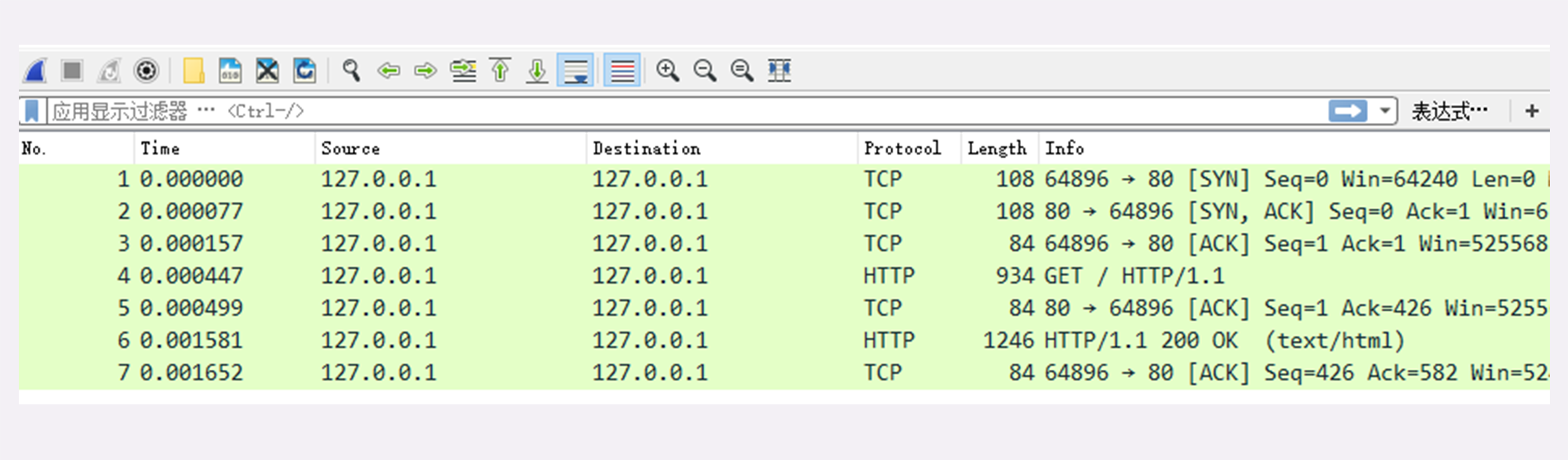 因为我们的实验环境运行在本机的127.0.0.1上,也就是loopback“环回”地址。所以,在Wireshark里要选择“Npcap loopback Adapter”,过滤器选择“HTTP TCP port(80)”,即只抓取HTTP相关的数据包。鼠标双击开始界面里的“Npcap loopback Adapter”即可开始抓取本机上的网络数据。
