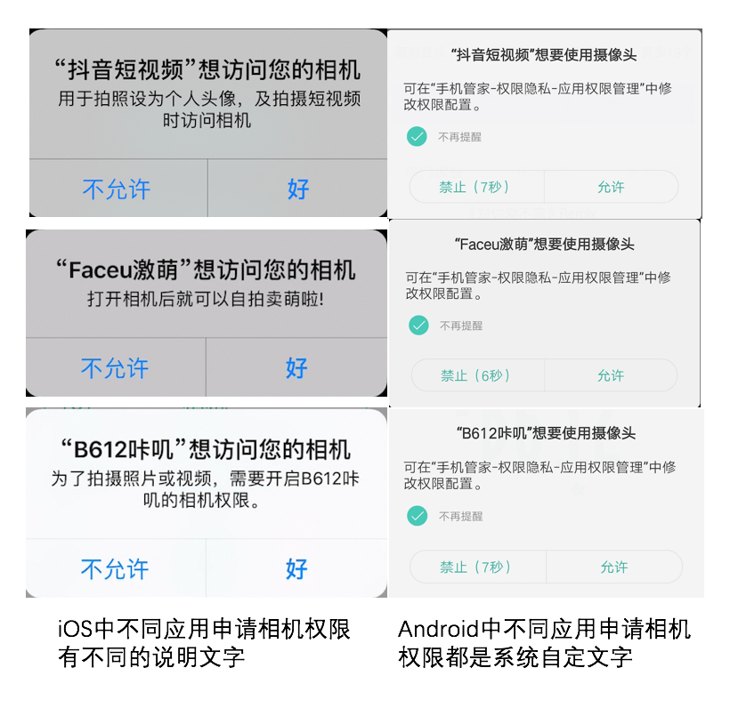 在Android中所有的系统授权弹窗都是不能添加说明的,而iOS在请求授权弹窗内可以添加简单的说明。这些说明提供了动机,增加了用户的知情权,在解除用户顾虑的同时强调了价值交换。你可以具体参考下图。