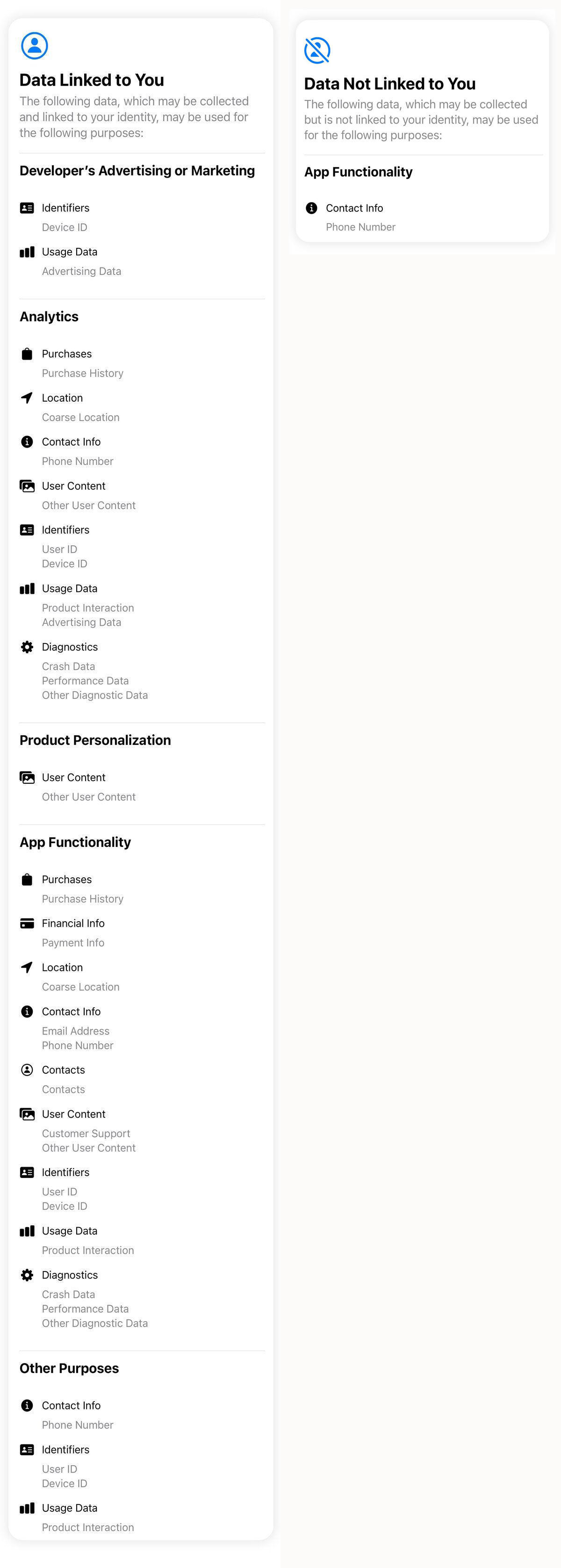 即便获取了权限,有些对业务并没有直接贡献的信息,或者并不适合于当前业务使用场景的信息,就不应该过多收集。下图是两个应用的隐私数据获取声明,左半部分是脸书旗下的WhatsApp,右半部分是Signal。