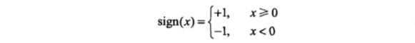 其中$x$代表输入的特征空间向量,输出空间是{-1, +1},$w$为权值向量,$b$叫作偏置,$sign$是一个符号函数。