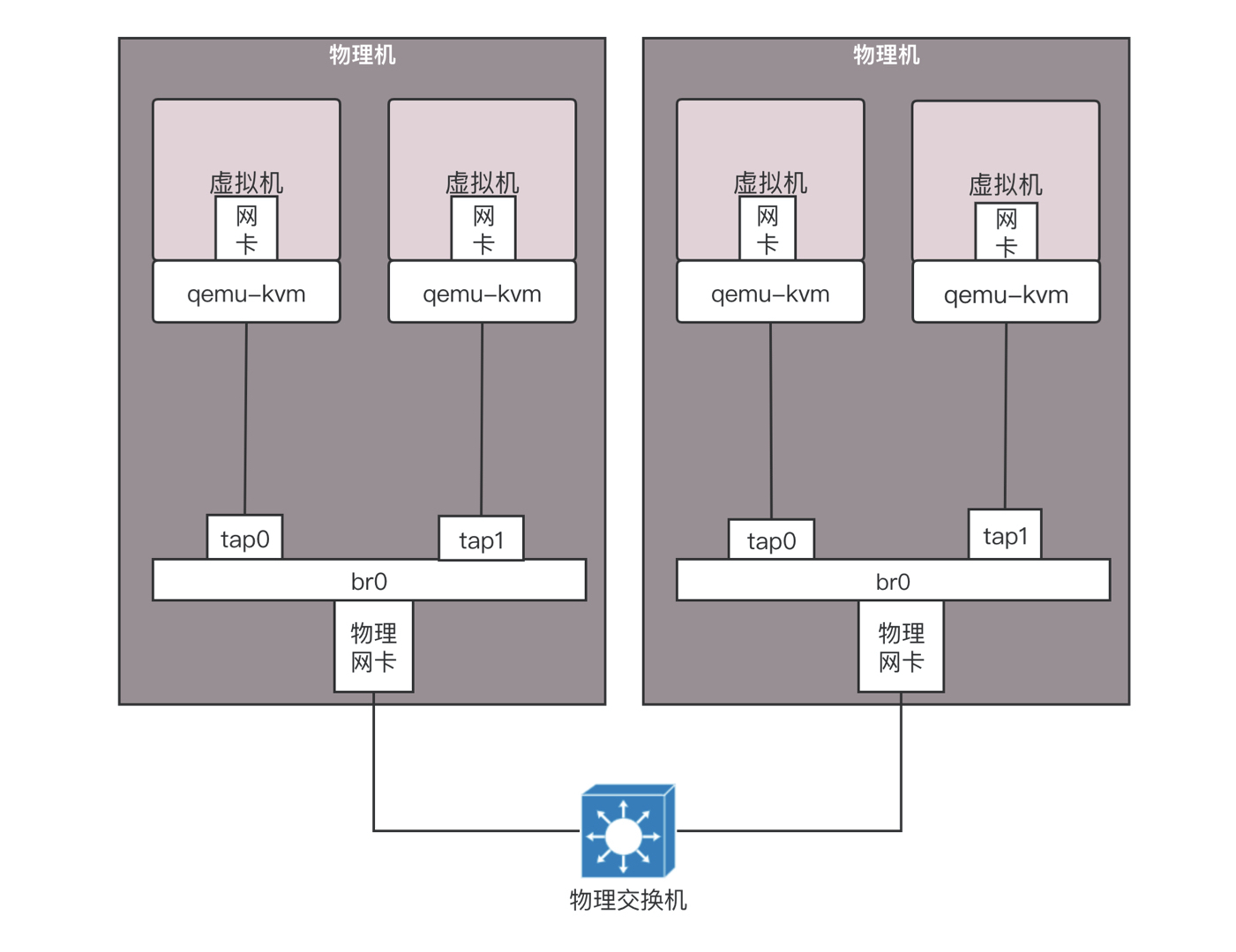 在数据中心里面,采取的也是类似的技术,只不过都是Linux,在每台机器上都创建网桥br0,虚拟机的网卡都连到br0上,物理网卡也连到br0上,所有的br0都通过物理网卡出来连接到物理交换机上。