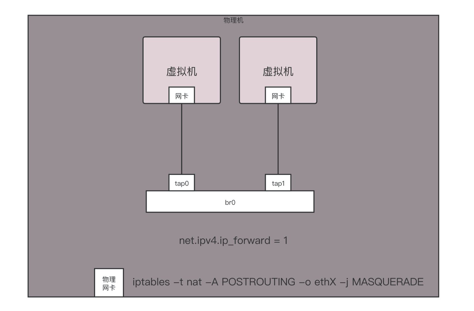 如果是你自己登录到物理机上做个简单配置,你可以简化一下。例如将虚拟机所在网络的网关的地址直接配置到br0上,不用DHCP Server,手动配置每台虚拟机的IP地址,通过命令iptables -t nat -A POSTROUTING -o ethX -j MASQUERADE,直接在物理网卡ethX上进行NAT,所有从这个网卡出去的包都NAT成这个网卡的地址。通过设置net.ipv4.ip_forward = 1,开启物理机的转发功能,直接做路由器,而不用单独的路由器,这样虚拟机就能直接上网了。