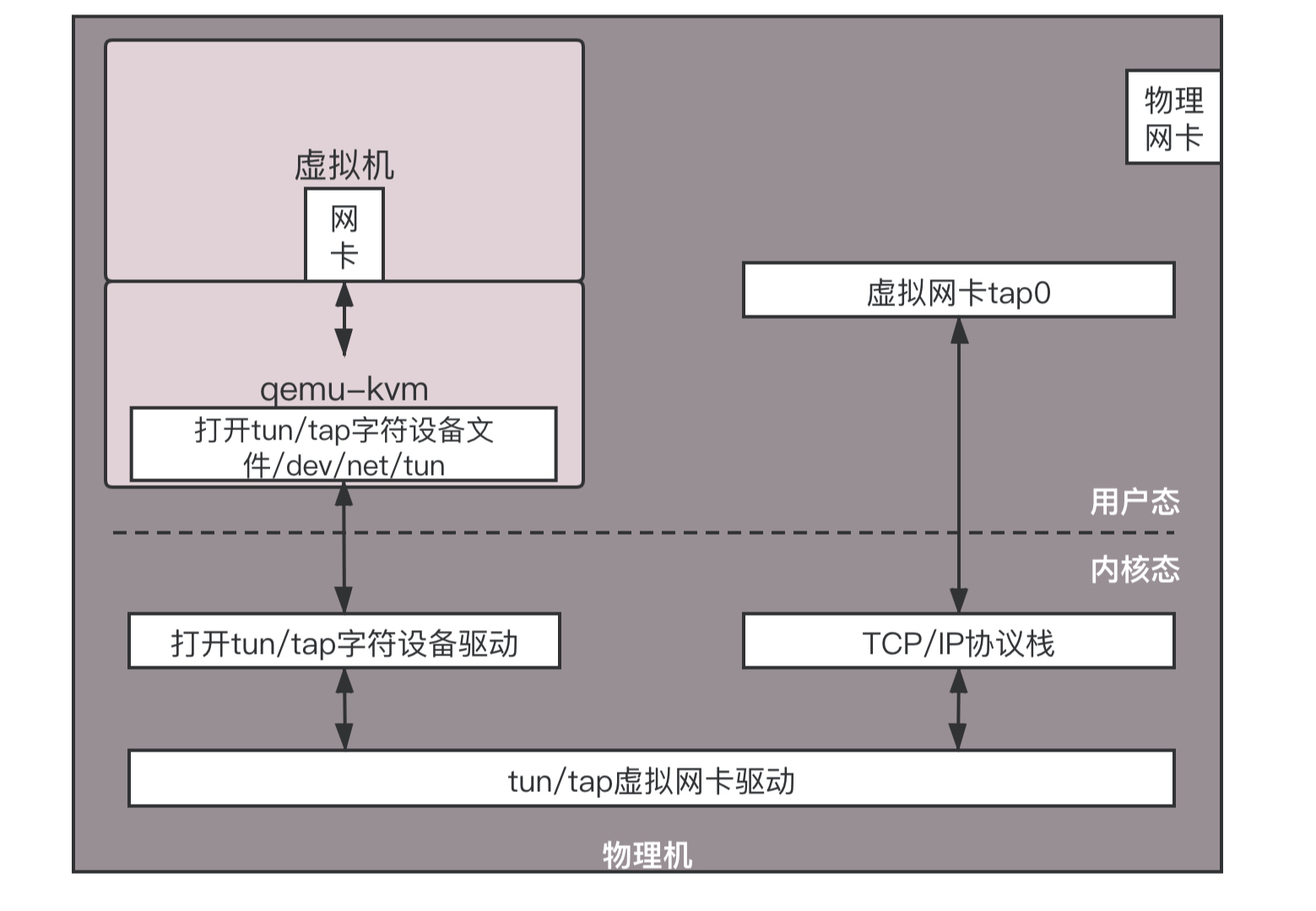 虚拟机是物理机上跑着的一个软件。这个软件可以像其他应用打开文件一样,打开一个称为TUN/TAP的Char Dev(字符设备文件)。打开了这个字符设备文件之后,在物理机上就能看到一张虚拟TAP网卡。