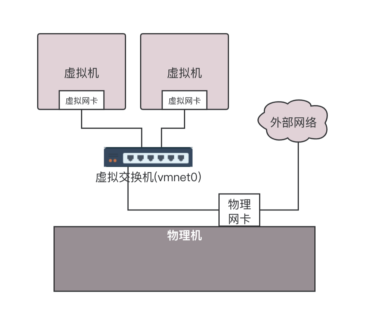 还记得我们在大学宿舍里做的事情吗?你可以想象你的物理机就是你们宿舍,虚拟机就是你的个人电脑,这些电脑应该怎么连接起来呢?当然应该买一个交换机。