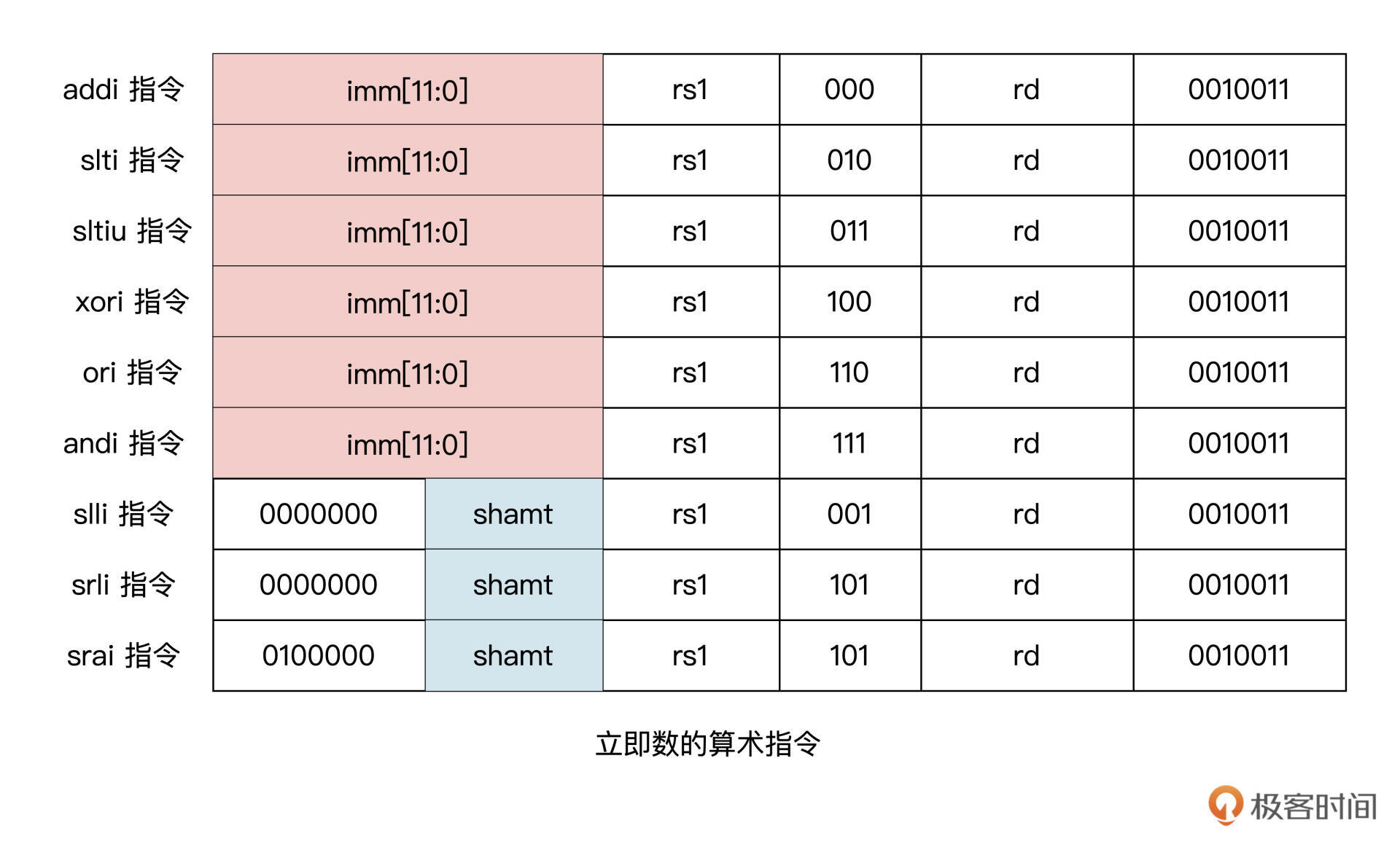 这些指令和其他指令集差不多,它们从寄存器读取两个 32 位的值,并将 32 位的运算结果再写回到目标寄存器。RV32I 还提供了这些指令的立即数版本,就是如下图所示的I型指令: