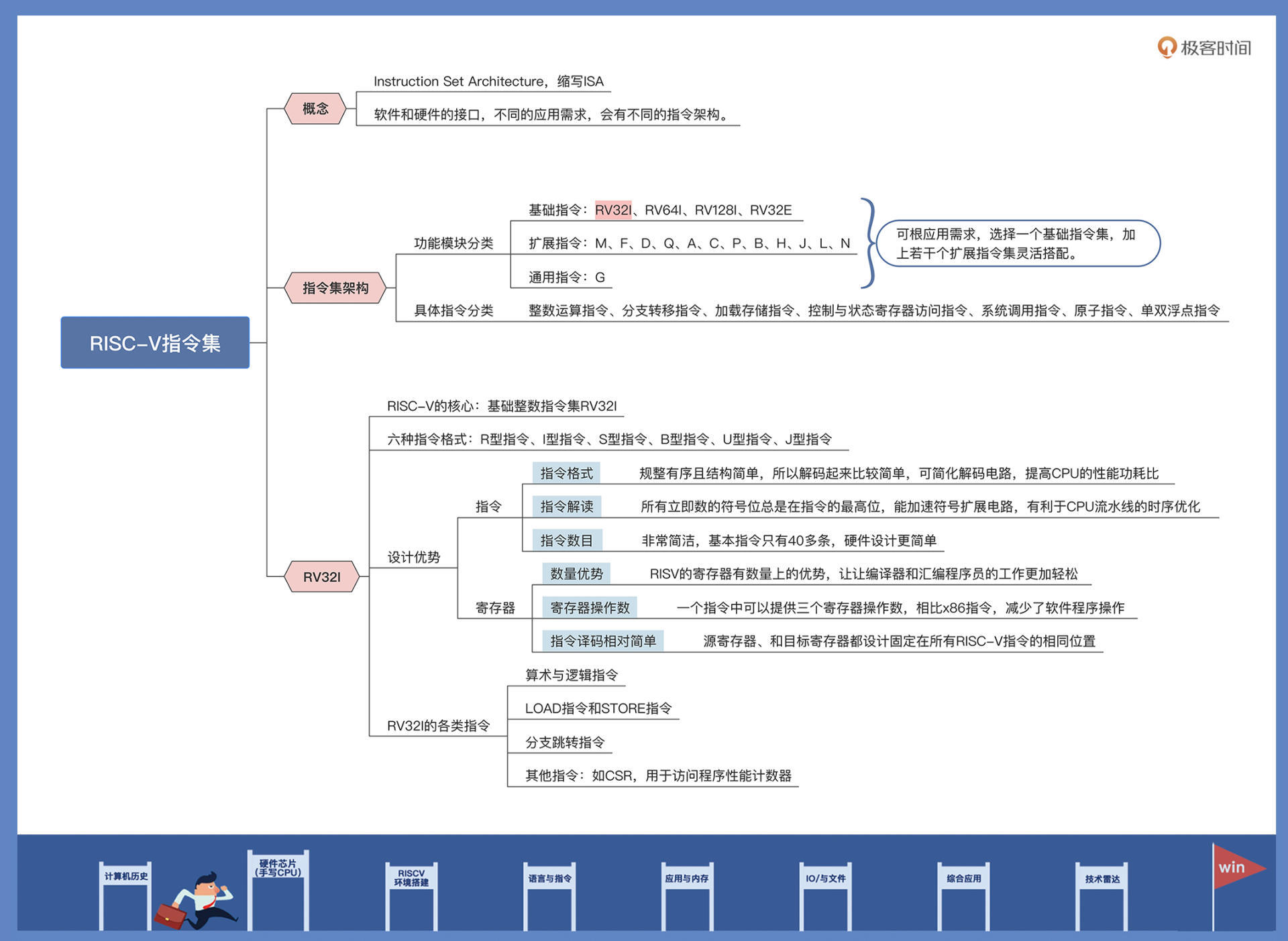 好,到这里,我们就把RISC-V的基础整数指令集——RV32I大体梳理了一遍。你可能感慨,比起训练一条狗,训练“CPU”要复杂得多。不过,通过RV32I这个最核心的指令集,我们也看到了 RISC-V的很多设计优势。